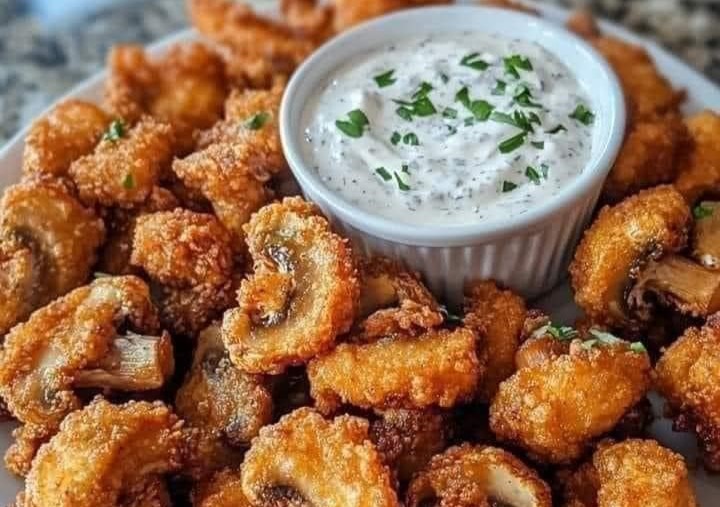 Golden, crunchy fried mushrooms with a creamy, herb-packed ranch dip. A perfect snack, appetizer, or party food.